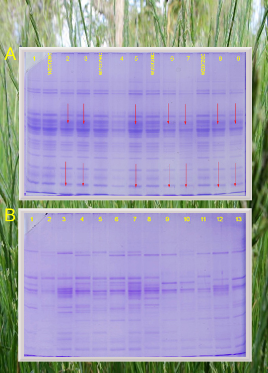 Białka ekstrahowane z połowy nasiona. Część z zarodkiem może być wykorzystana do selekcji fenotypów (żel B)